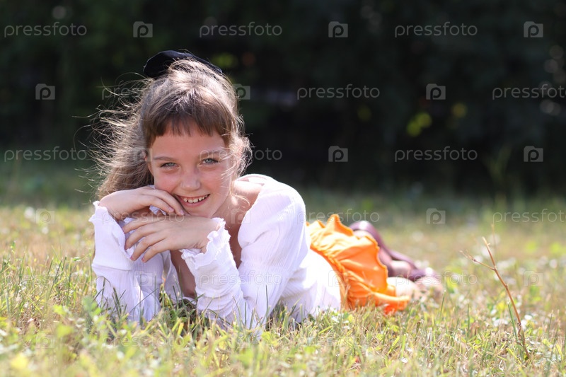 Девочка-школьница лежит на траве в парке
