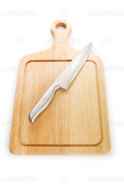 Разделочная доска с ножом на белом фоне