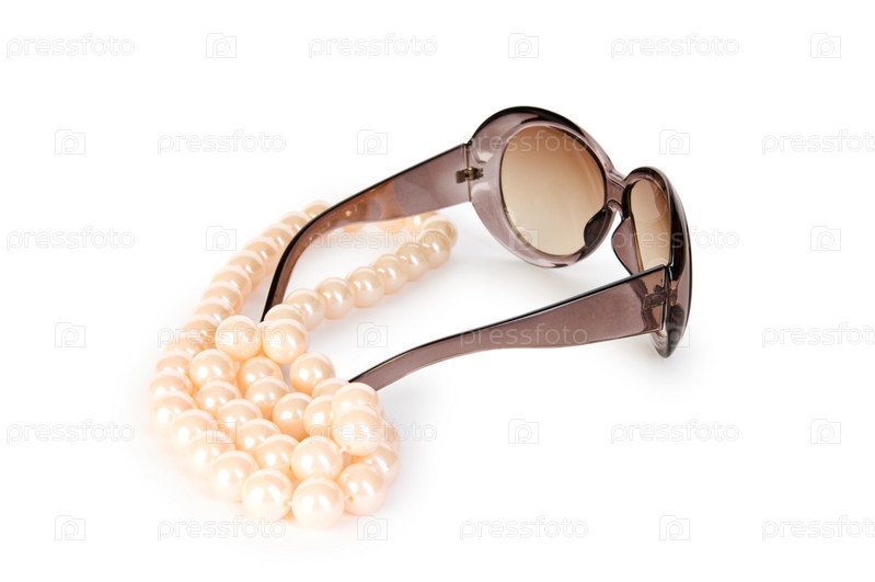 Жемчужное ожерелье и солнцезащитные очки на белом фоне