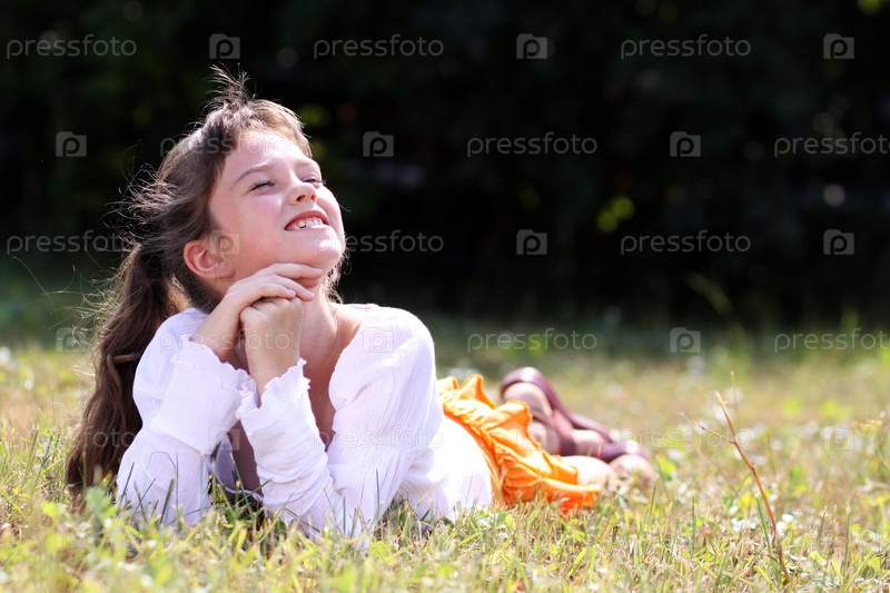 Девочка-школьница лежит на траве в парке