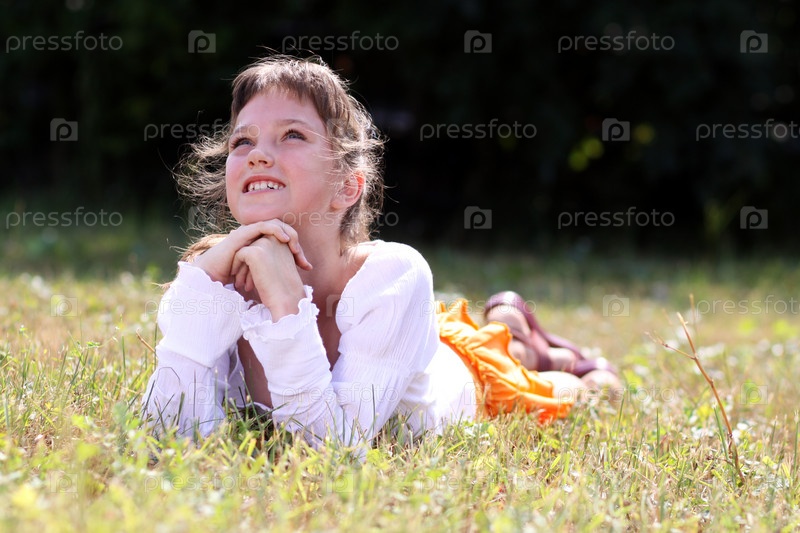 Девочка-школьница лежит на траве в парке