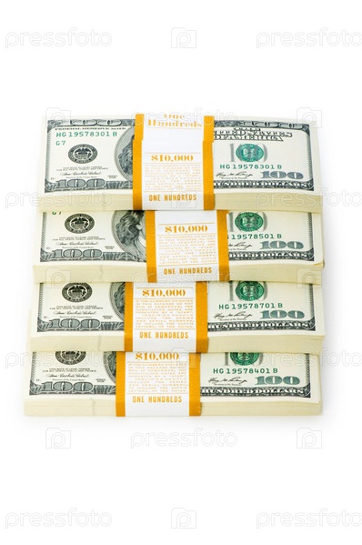 Четыре пачки долларов на белом фоне