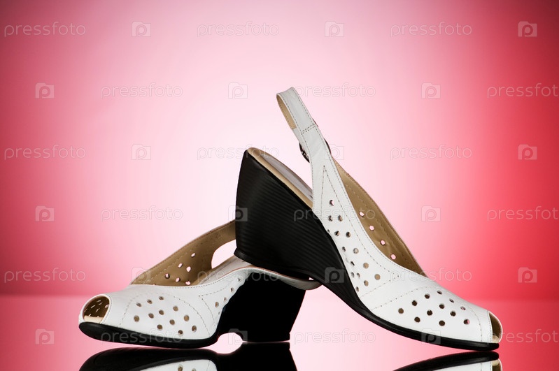 Женские летние туфли на танкетке на розовом фоне