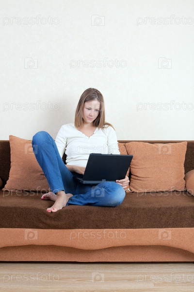 Молодая красивая женщина с ноутбуком на диване