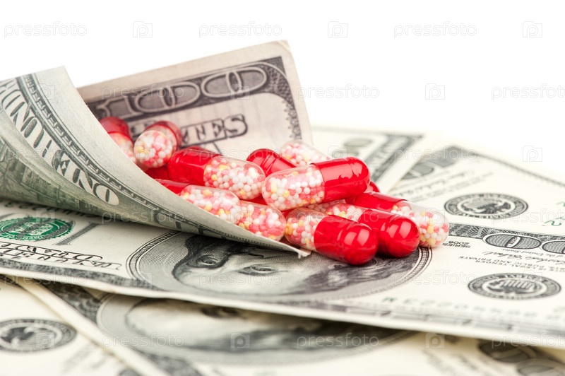 Таблетки и деньги на белом фоне