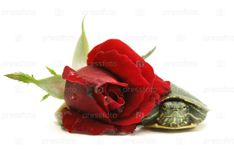 Маленькая черепаха и красная роза на белом фоне