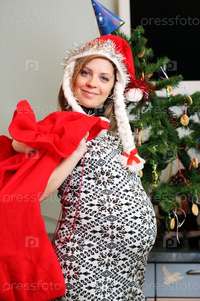 Беременная девушка в новогоднем колпаке