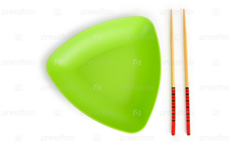 Зеленая тарелка с китайскими палочками на белом фоне