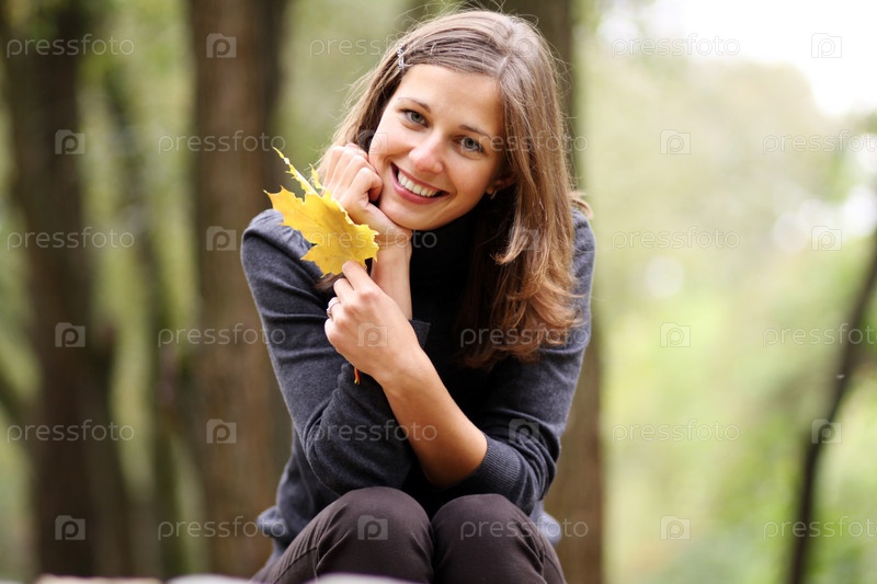 Красивая молодая женщина с желтым листом