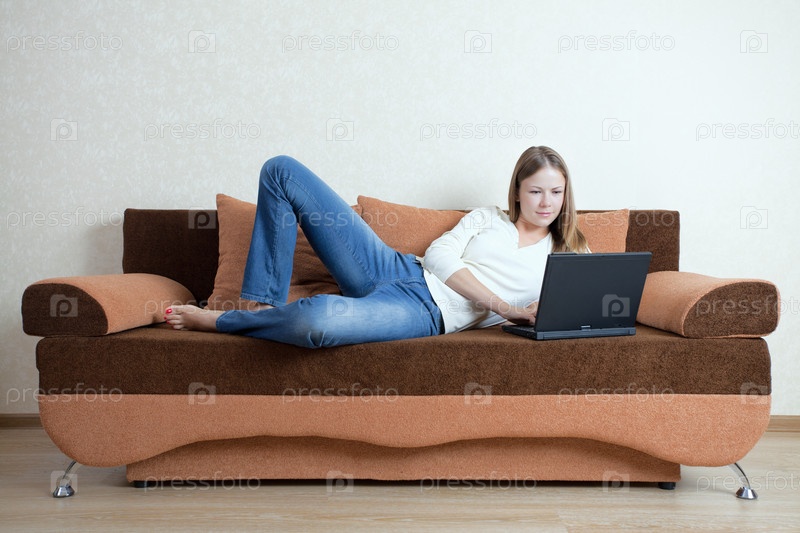 Молодая девушка с ноутбуком на диване