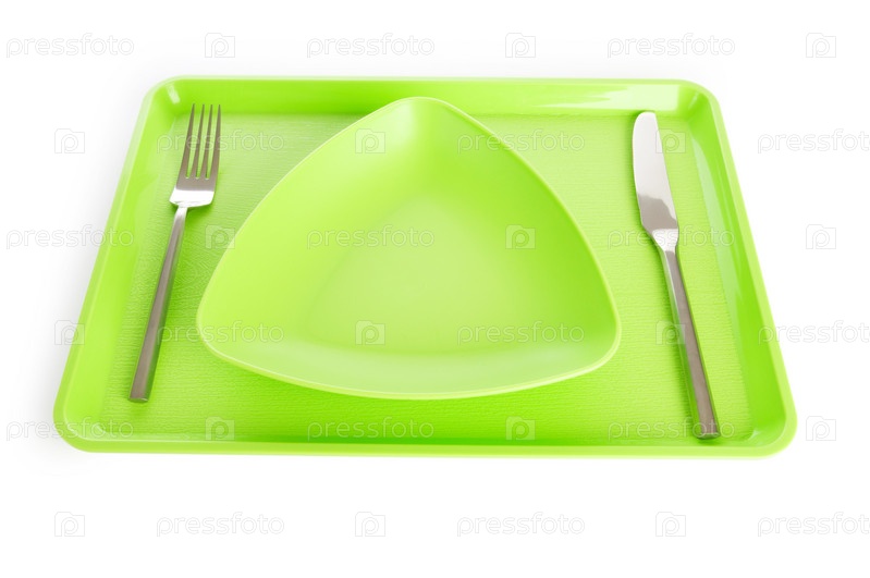 Зеленая треугольная тарелка на подносе со столовыми приборами на белом фоне