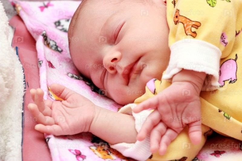 Спящий милый младенец в желтой одежде