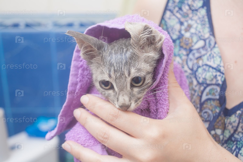 Мокрая кошка в полотенце после купания