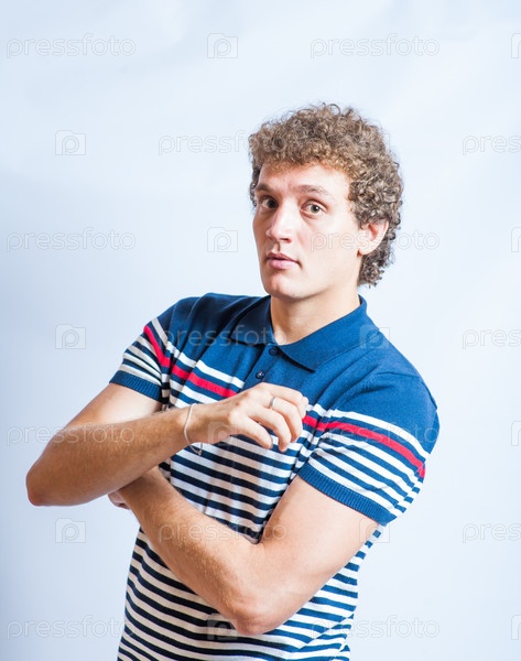 Молодой блондин в повседневной одежде на сером фоне