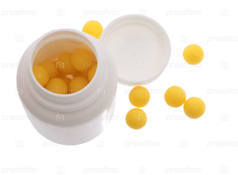 Витамины разбросаны на белом фоне