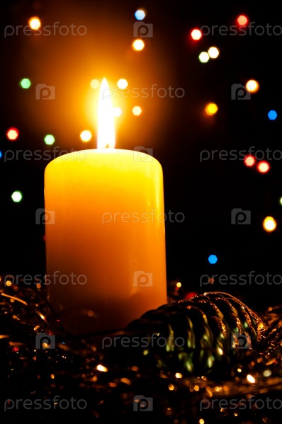 Свеча и елочная игрушка на абстрактном фоне