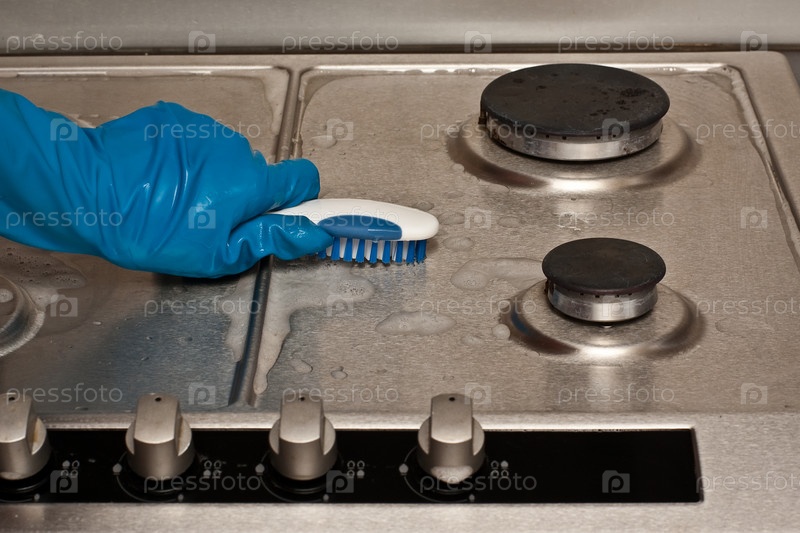 Рука в защитной синей перчатке полирует газовую плиту желтым пылесосом