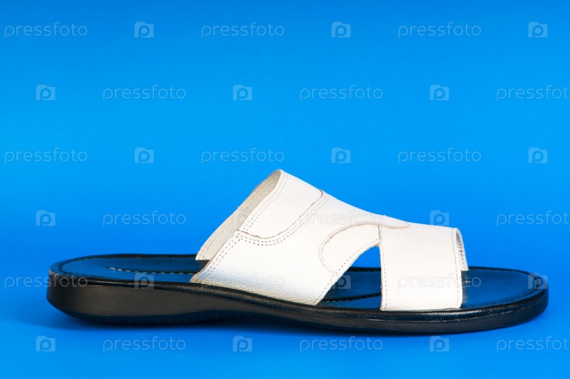 Белый мужской шлепанец на голубом фоне