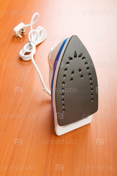 Современный электрический утюг на деревянном фоне