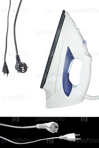 Современный электрический утюг и шнур на белом фоне