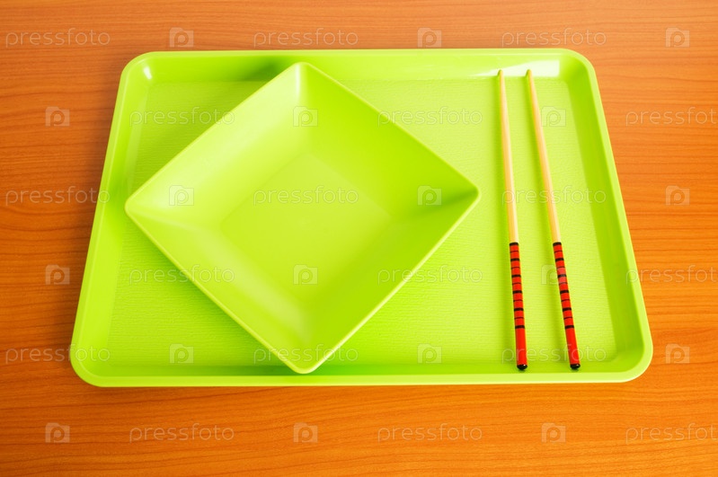 Квадратная тарелка и китайские палочки на зеленом лотке