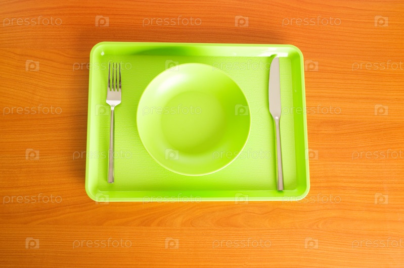 Зеленая тарелка с ножом и вилкой на зеленом лотке
