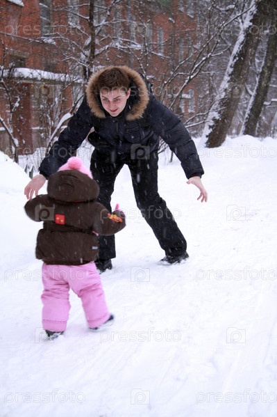 Папа с ребенком играют на улице зимой