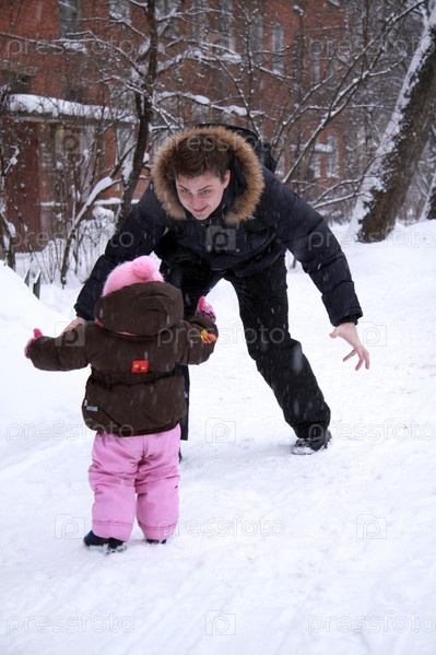 Папа с ребенком играют на улице зимой