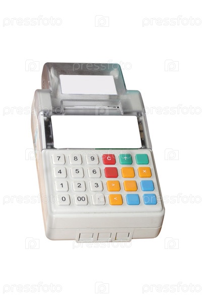 Портативный кассовый аппарат на белом фоне