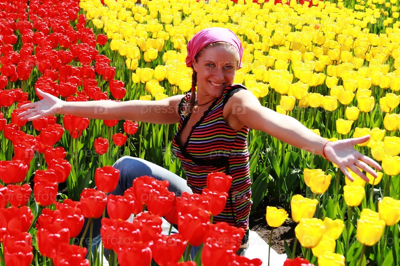 Девушка сидит в плантации красных и желтых тюльпанов