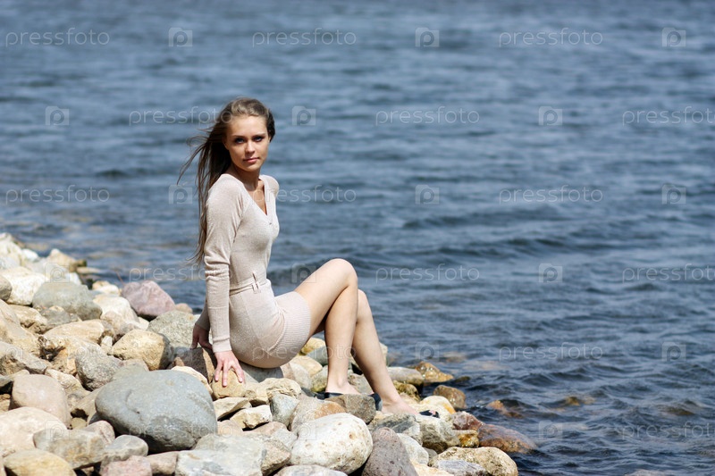 Девушка в сером платье сидит на камнях на берегу озера