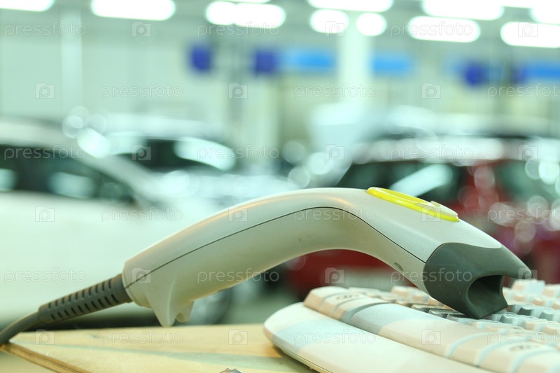 Сканер и клавиатура на фоне размытых автомобилей