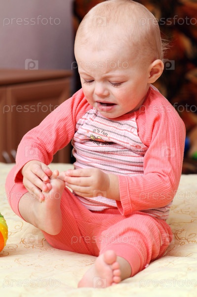 Маленький ребенок плачет, рассматривая свою ногу