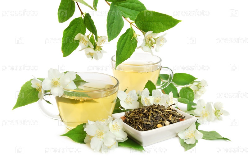 Органические чайные листья жасмина со свежими цветками жасмина и чашками чая на белом фоне