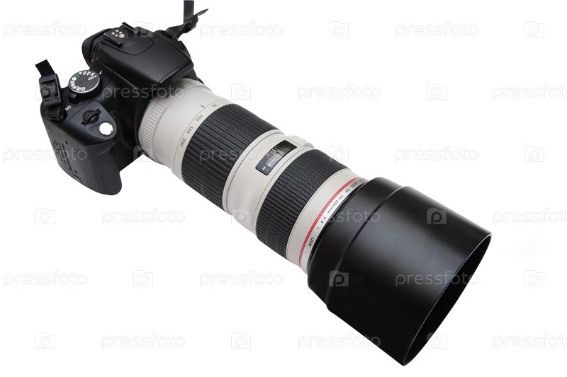 Фотоаппарат с телеобъективом на белом фоне