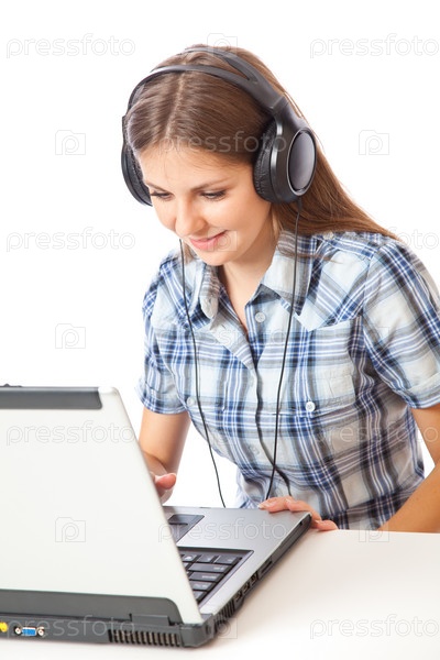 Девочка-подросток в наушниках сидит у ноутбука