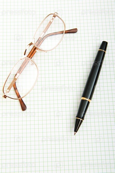 Очки и ручка на листе в клеточку