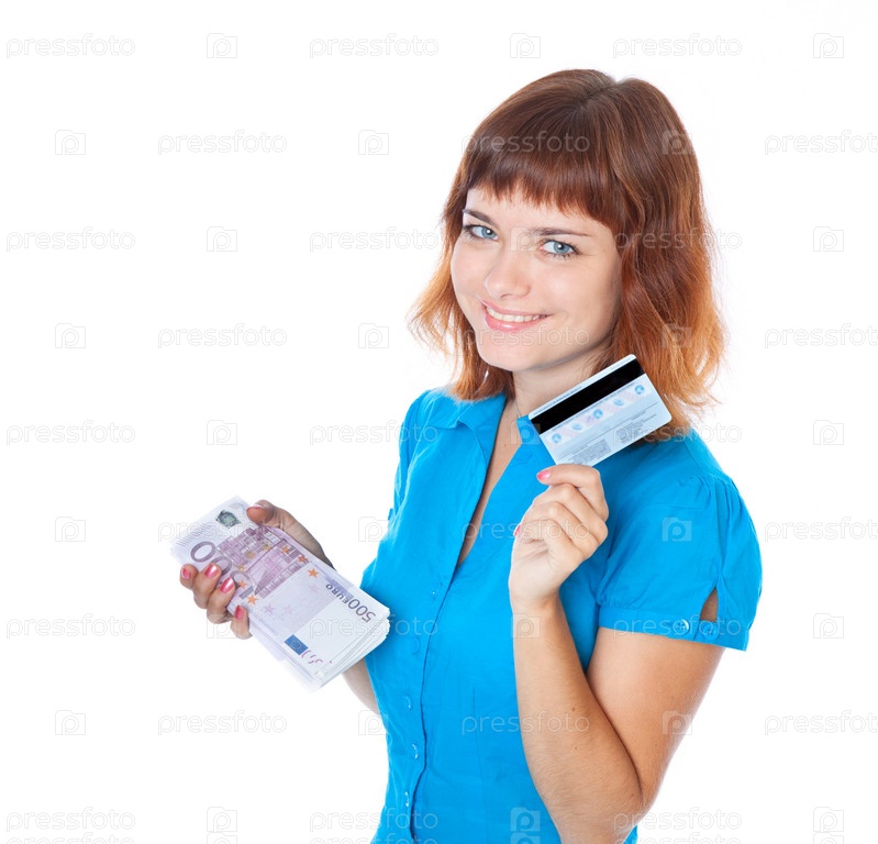 Рыжеволосая девушка с кредитной картой и пачкой евро