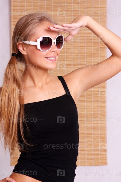 Белокурая женщина в солнцезащитных очках смотрит вдаль