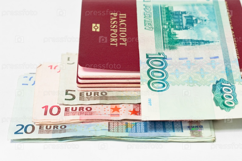 Паспорта, евро и рубли на белом фоне