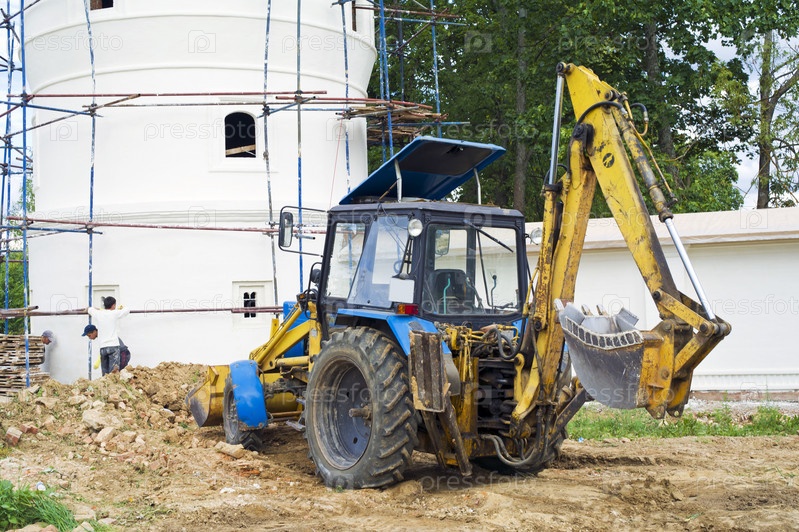 Трактор рядом с церковным забором