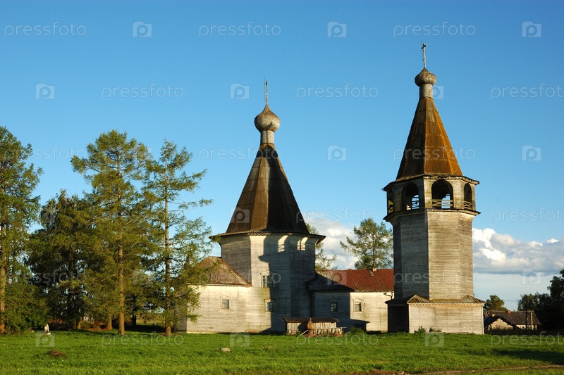 Древняя деревянная русская сельская церковь и колокольня в Ошевенске