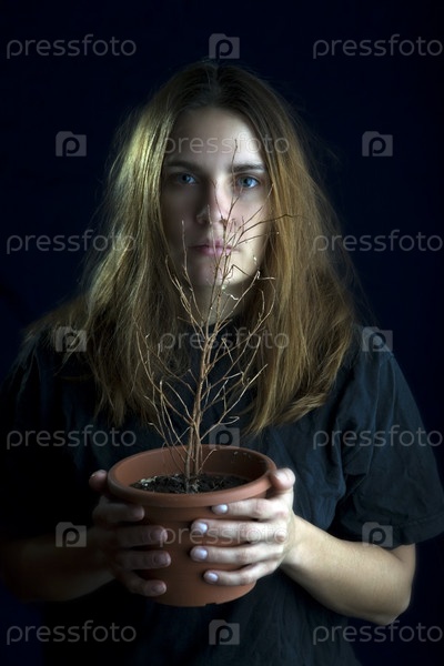 Портрет девушки с засохшим растением в цветочном горшке