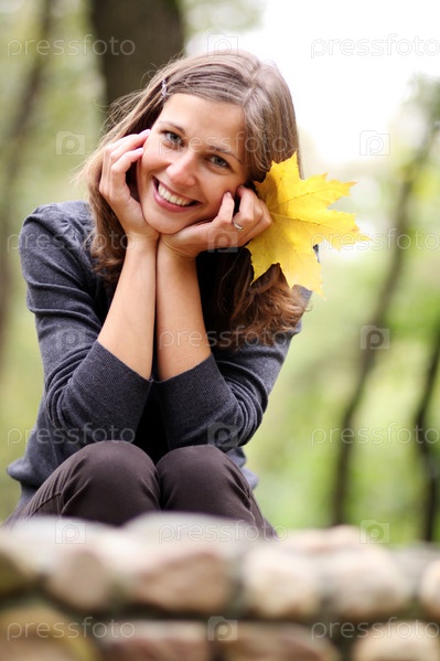 Портрет счастливой молодой женщины с кленовыми листьями
