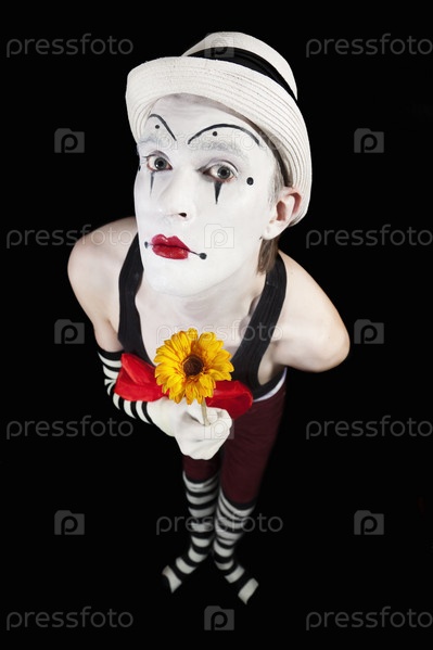 Мужчина мим с цветком и в шляпе