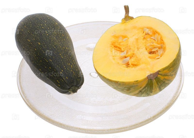 Порез и zucchini в прозрачной тарелке на белом фоне