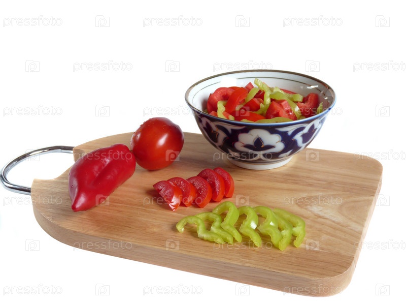 Болгарский перец помидор и чашка на разделочной доске