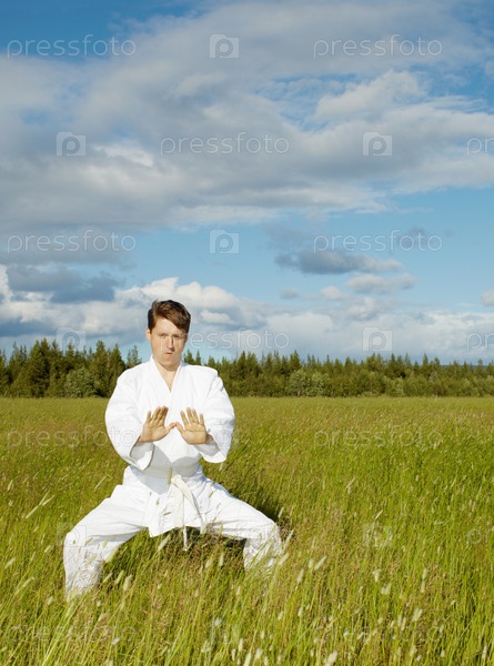 Мастер восточных единоборств тренируется в поле