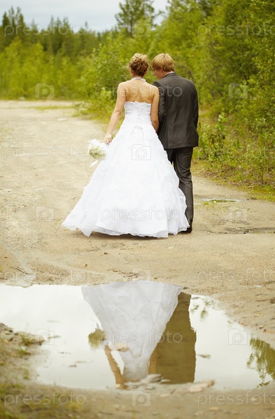 Пара новобрачных, идущих по дороге