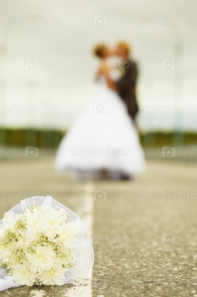 Сфокусированный свадебный букет с целующимися новобрачными на размытом фоне